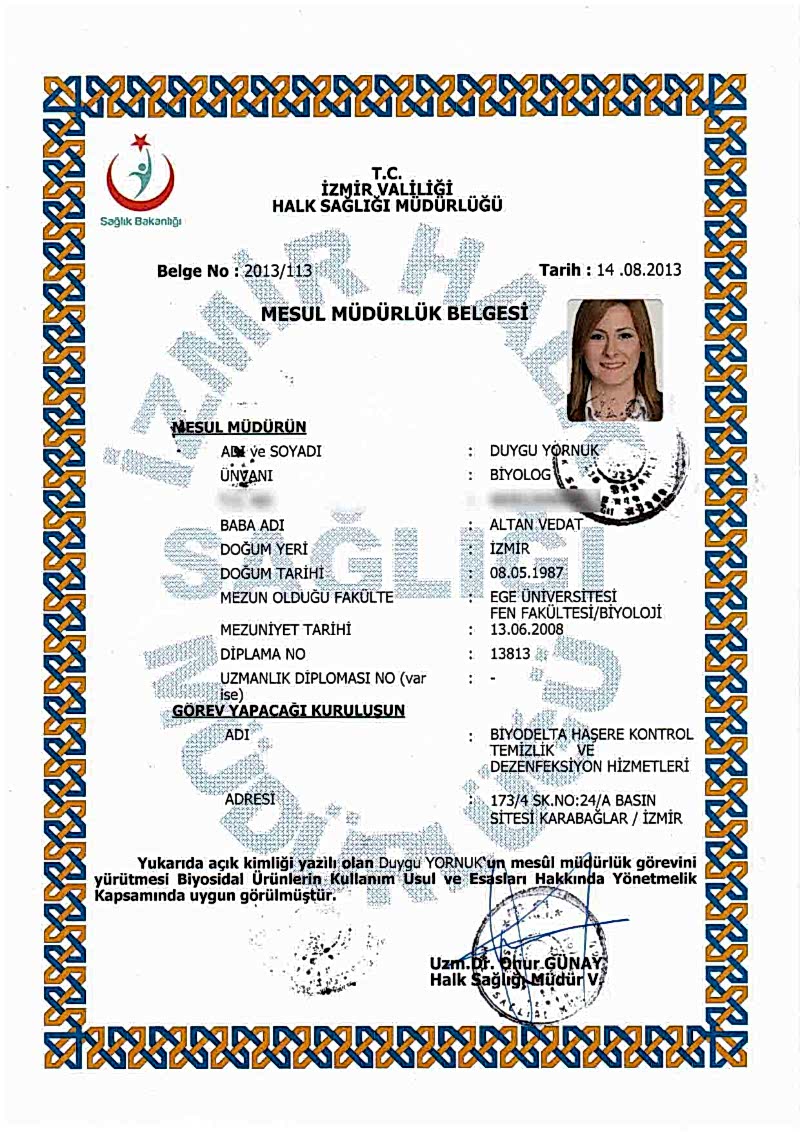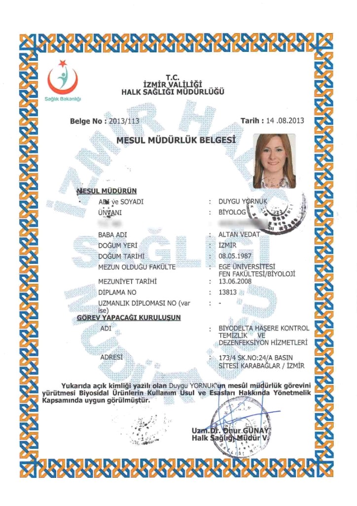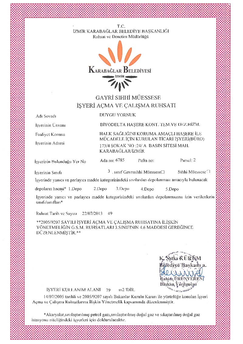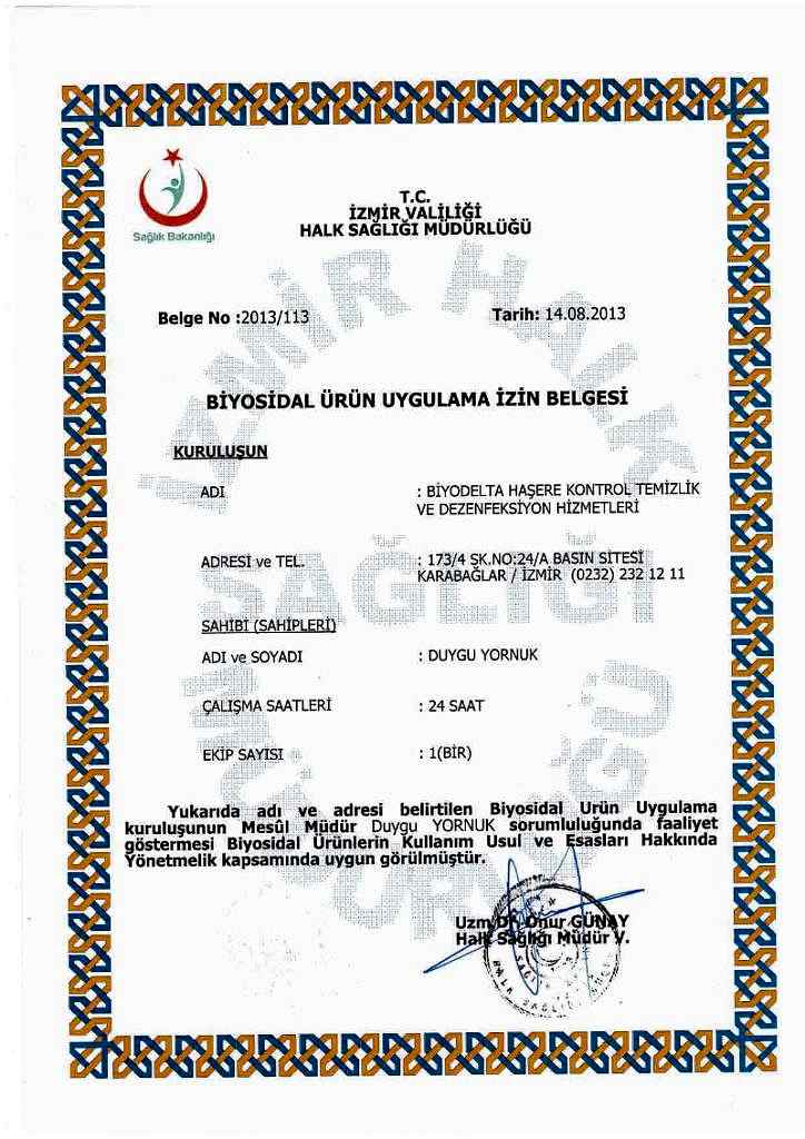 İlaçlamalarımızda, Sağlık Bakanlığı'nın onayladığı alet, ekipman ve biosidal ilaçlarla hizmet vermekteyiz.